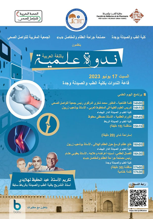 نظمت الجمعية المغربية للتواصل الصحي -فرع وجدة بشراكة مع مصلحة جراحة العظام والمفاصل وكلية الطب والصيدلة بوجدة ندوة علمية حول أمراض العظام. وبمشاركة الأستاذ بوشيعب زريول أستاذ كلية الطب والصيدلة بالدار البيضاء والأستاذ مصطفى محفوظ (كلية الطب بالرباط) والأستاذ يعقوبي هشام رئيس مصلحة جراحة العظام والمفاصل "ب" وكلية الطب والصيدلة بوجدة.
